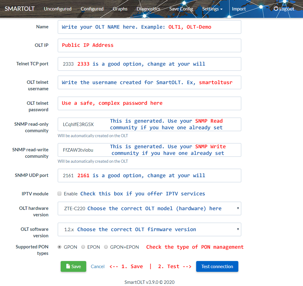 VERY IMPORTANT to know! It makes no difference if your OLT is in a lab/testing, or in production/network! When you add the OLT for the first time, SmartOLT will ONLY READ the OLT configuration so it can populate the database. NO CHANGES are made to the OLT while adding and importing ONUs.